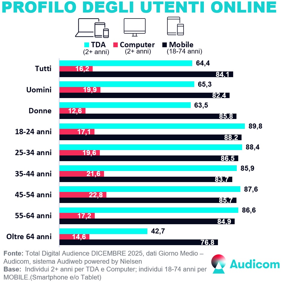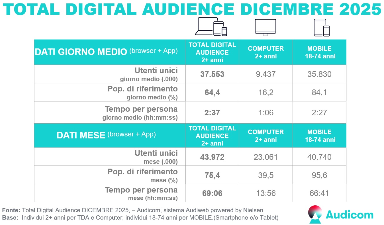 Sono disponibili i dati della total digital audience del mese di Dicembre 2025, prodotti dal sistema Audiweb e distribuiti da Audicom.