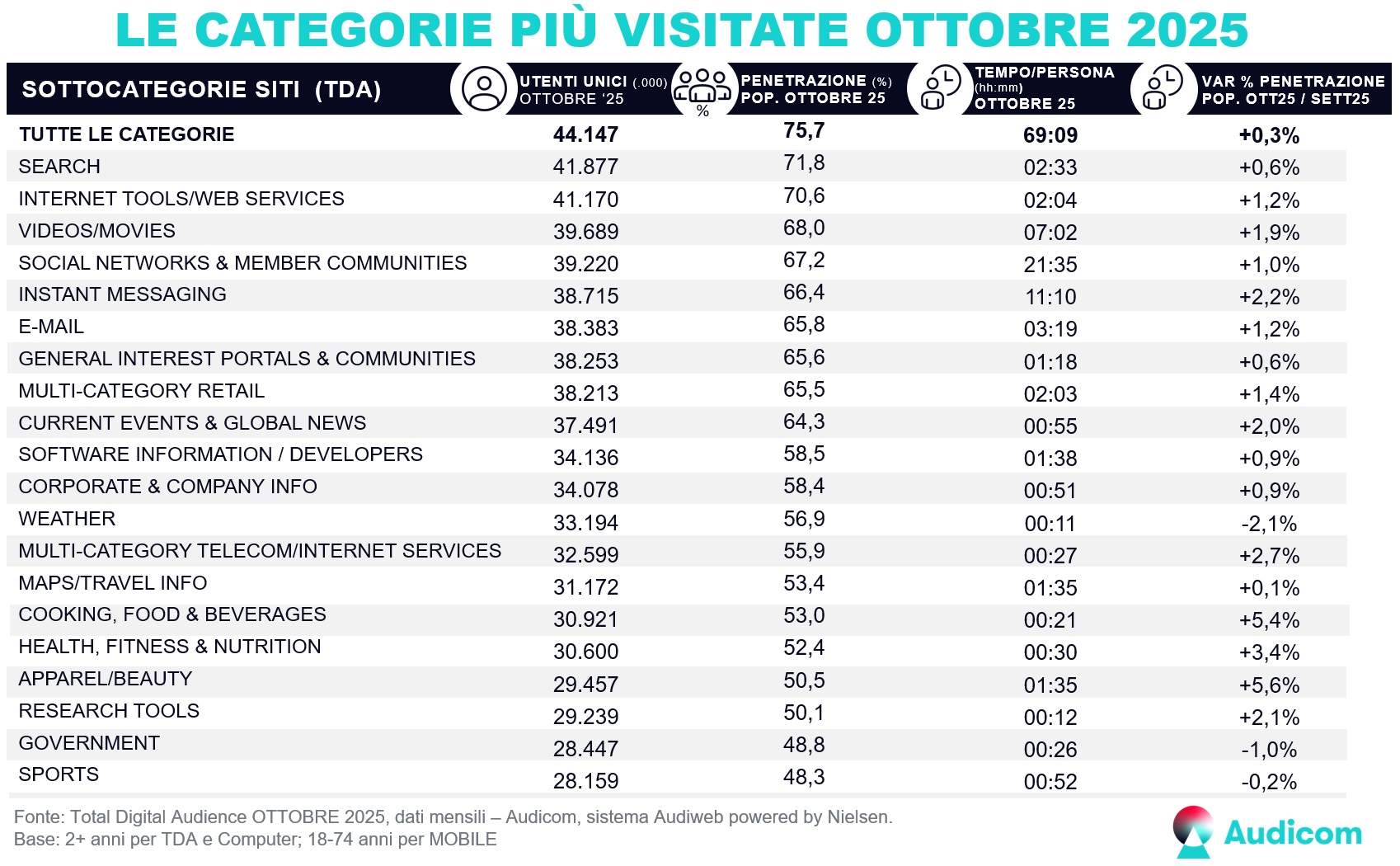 Nel mese di ottobre 2025 sono state 44,1 milioni le persone dai 2 anni in su che hanno navigato da Computer e Mobile (Smartphone e/o Tablet), online per 69 ore complessive. Nel giorno medio hanno navigato quasi 37,7 milioni di individui dai 2 anni in su, con un incremento del 7,3% dell’audience da Computer, tipico in questo mese in cui tutte le attività ordinarie si stabilizzano.